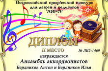 Учащиеся ДШИ №1 приняли участие во Всероссийском творческом конкурсе для детей и педагогов "Лира". В номинации вокальное и музыкальное творчество Хусаенова Лиана и Гуршева Екатерина заняли II место (преп. Давлетшина А.Л.) В номинации музыкальное исполнительство ансамбль аккордеонистов Бердников Антон и Бердников Илья заняли II место (преп. Исхакова Л.А.) Поздравляем!