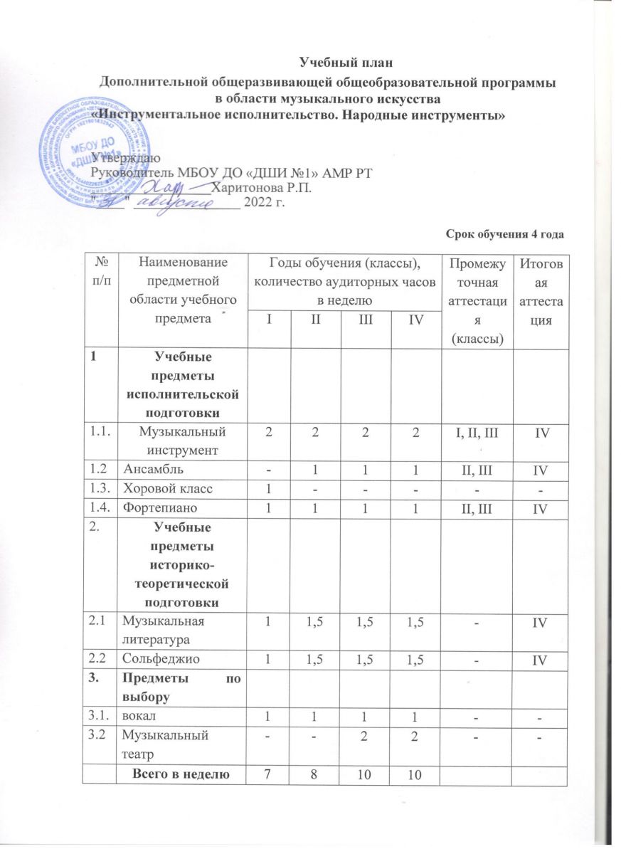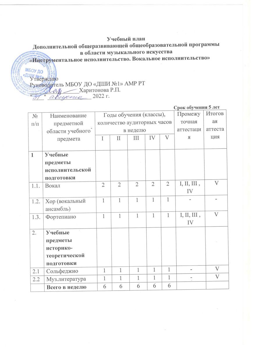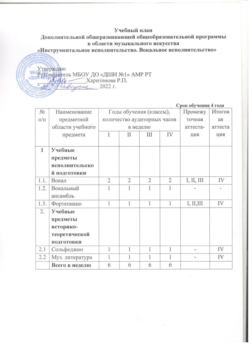 Учебный план МБОУ ДО "ДШИ №1" ДООП "Вокальное исполнительство" 4 года Учебный план МБОУ ДО "ДШИ №1" ДООП "Вокальное исполнительство" 5 лет