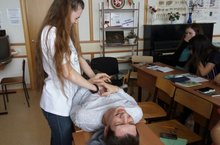 На уроке ОБЖ первый курс практиковался оказывать первую медицинску помощь. Одно дело теория, другое практические занятия.