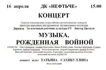 16 апреля 2015 г. в 15.00 , В ДК "Нефтьче" состоится концертЛауреата международных, всероссийских и республиканских конкурсов оркестра народных инструментов музыкального колледжа, дирижер, Заслуженный работник культуры РТ Виктор Цветков "Музыка рожденная войной"