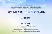 Поздравляем студентку 4 курса специальности "Эстрадное пение" Мияссарову Минсылу со званием Гран-При по итогам всероссийского конкурса инструментального, вокального, хореографического, театрального, декоративно-прикладного искусства "МУЗЫКА ВЕЛИКОЙ СТРАНЫ" (преподаватель Сафина А.А.)