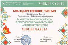 Камиля Шакертзянова награждена Благодарственным письмом оргкомитета за участие во Всероссийском детско-юношеском фестивале народного творчества "Милли хәзинә" 13.12.2023