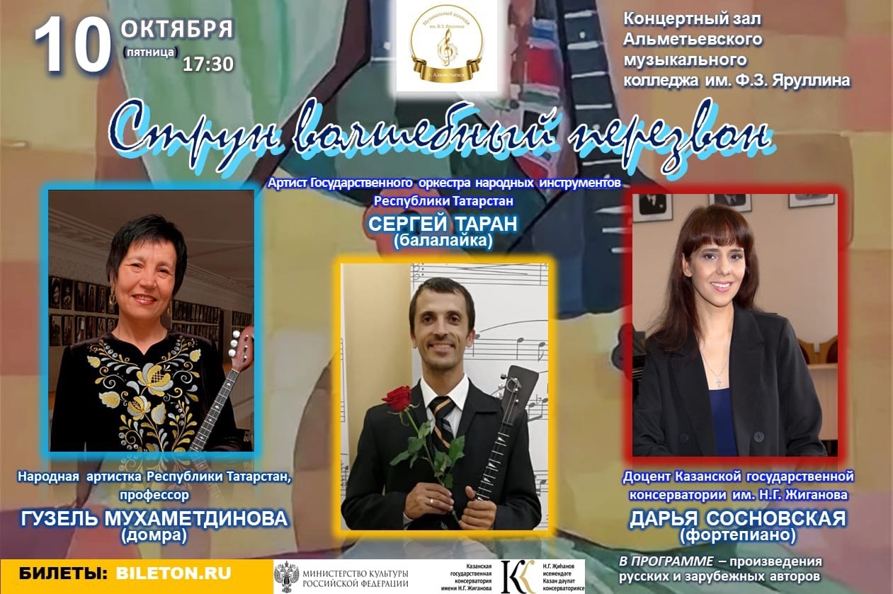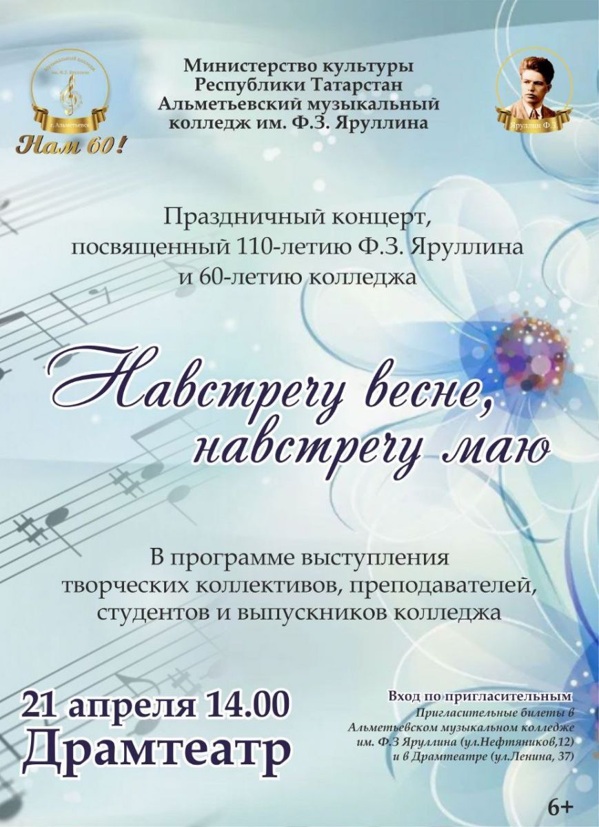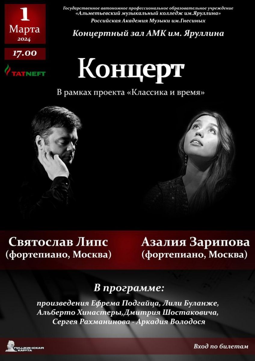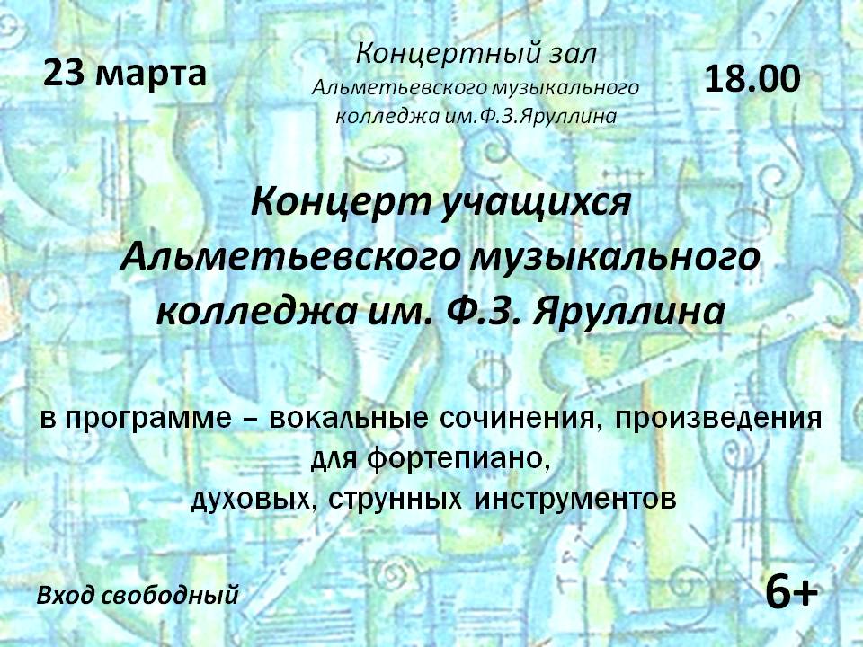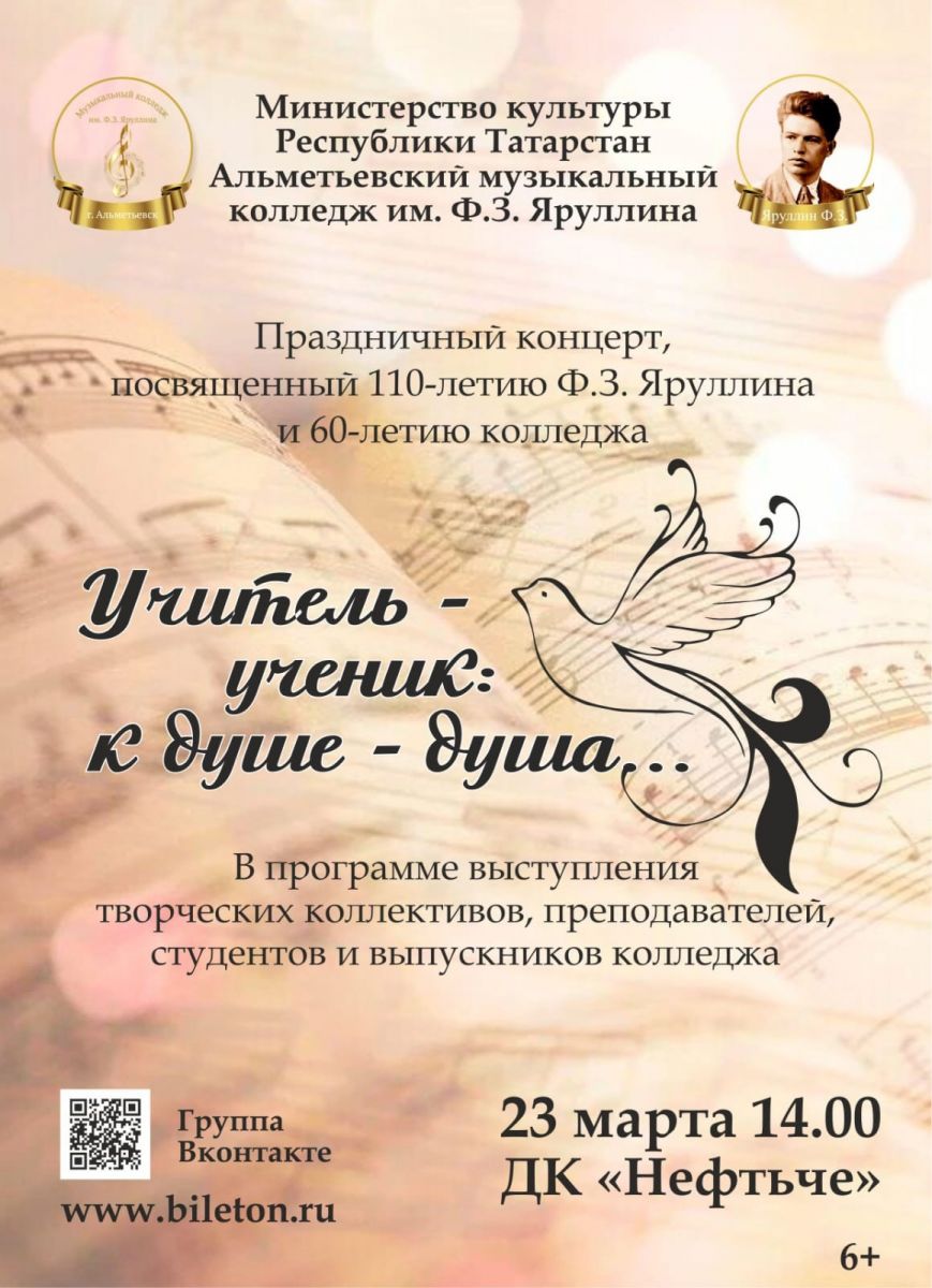 23 Марта 2024 г. в 14:00 - Юбилейный концерт Альметьевского музыкального колледжа им.Ф.З.Яруллина «Учитель-ученик: к душе-душа…» АФИША БИЛЕТЫ