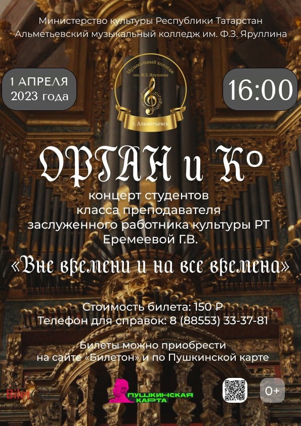 1 Апреля 2023 г. в 16:00 - Концерт органной музыки "Вне времени и на все времена" БИЛЕТЫ АФИША