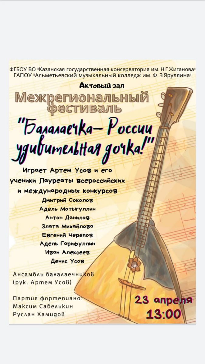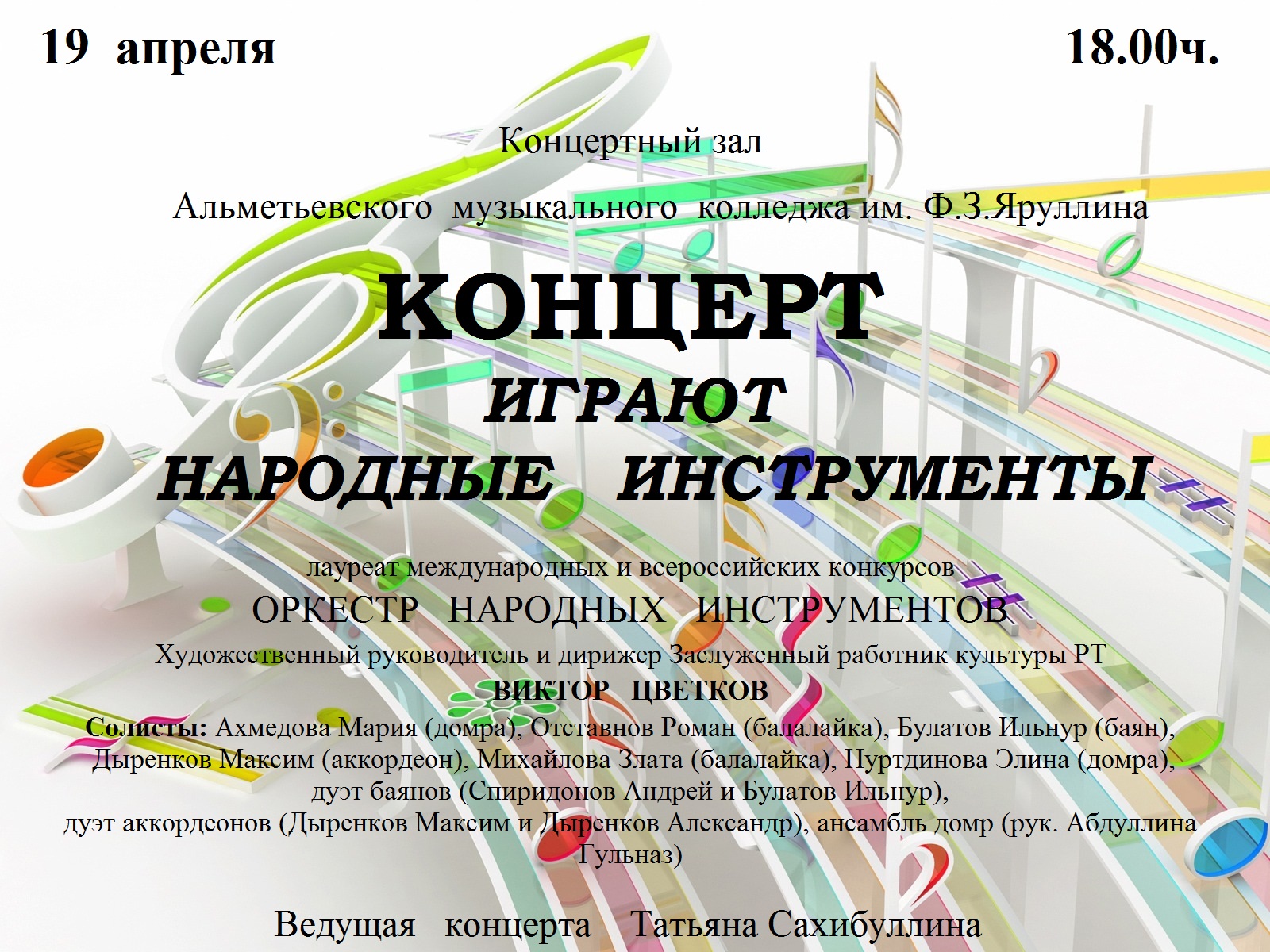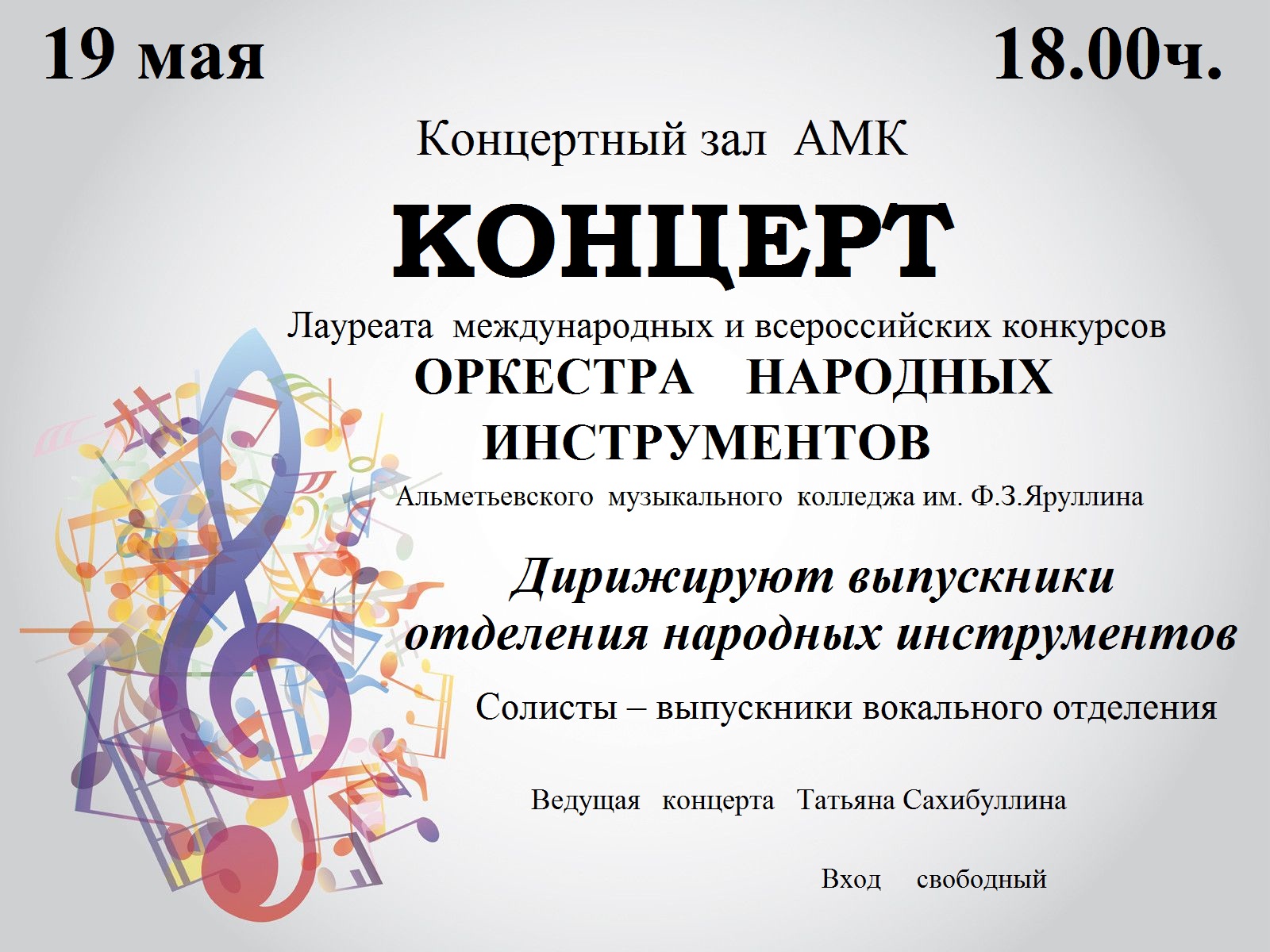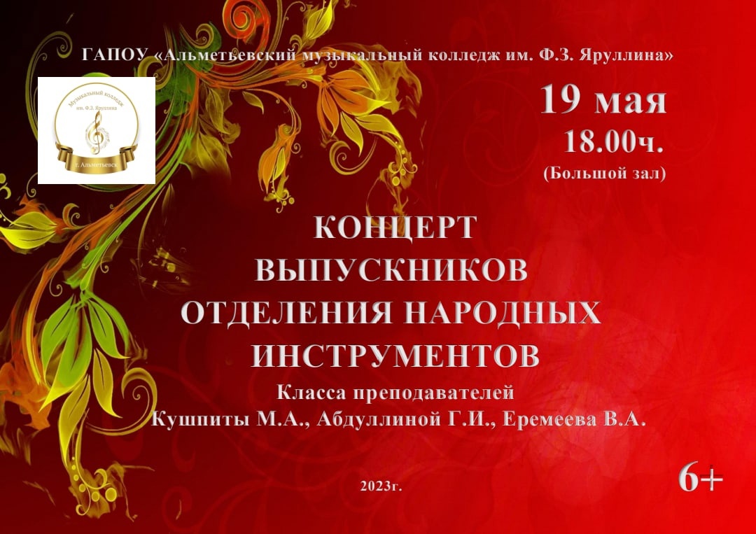 19 Мая 2023 г. в 28:00 - Концертная программа от выпускников отделения народных инструментов АФИША