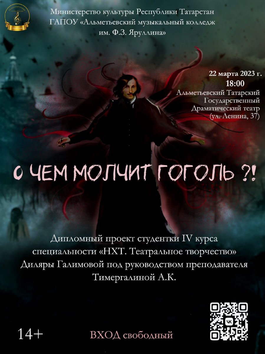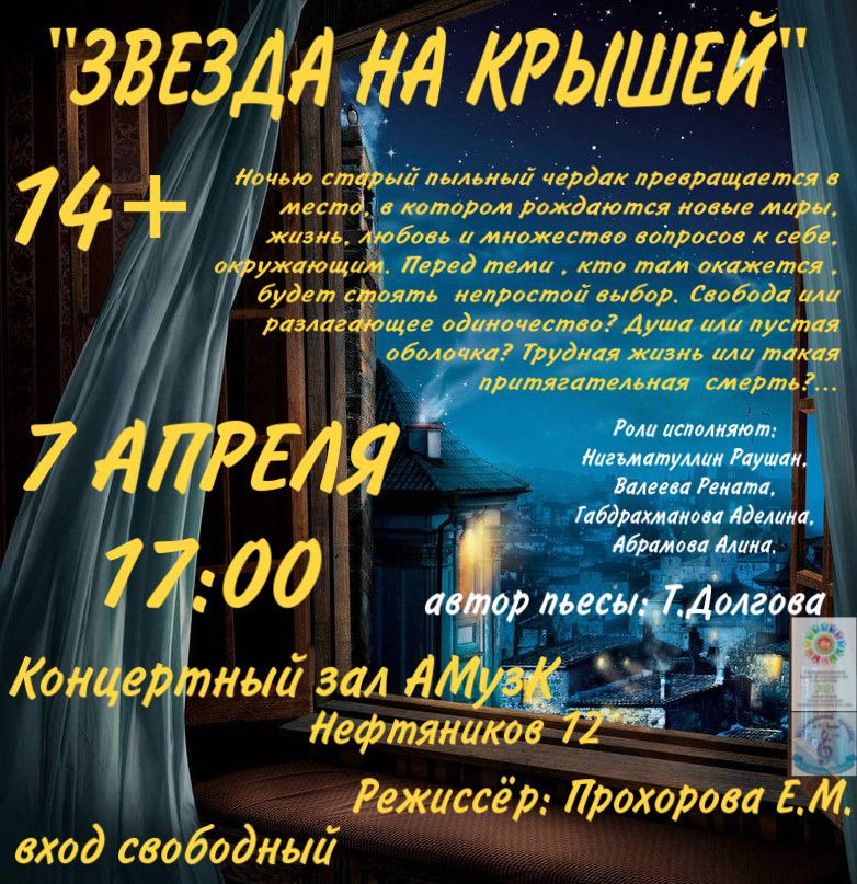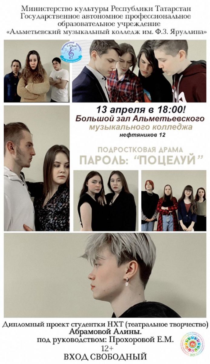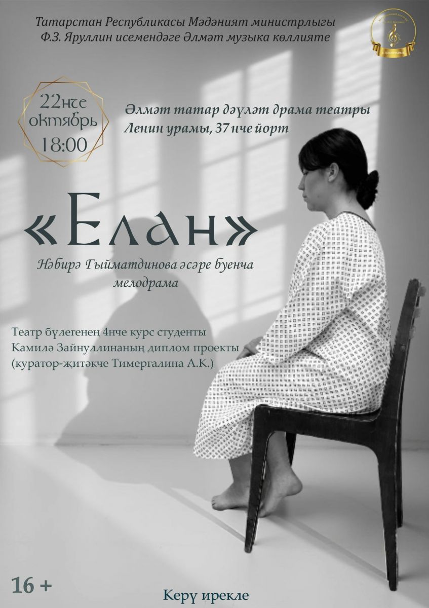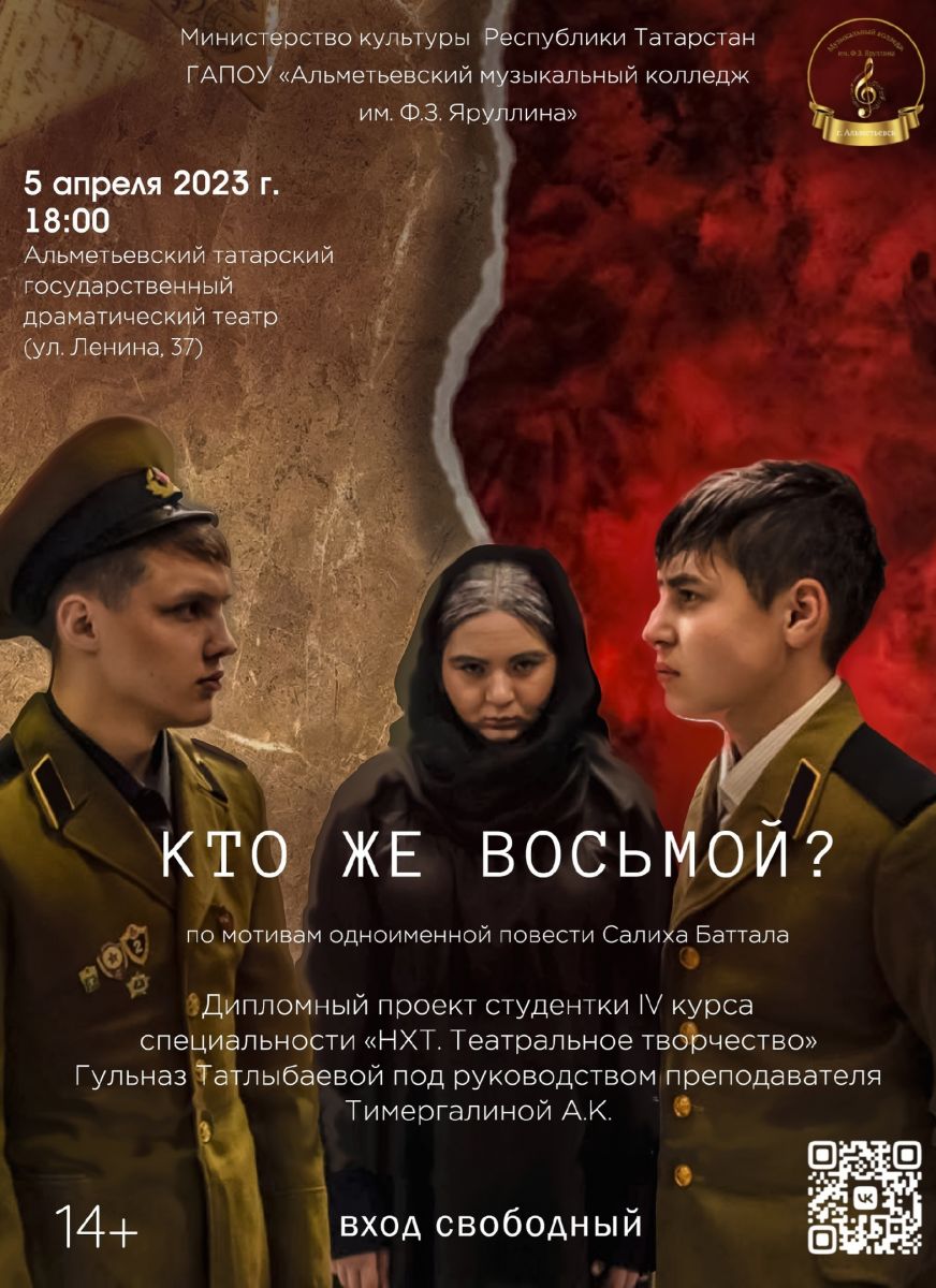 5 Апреля 2023 г. в 18:00 - Показ дипломного проекта студентки lV курса специальности "НХТ.Театральное творчество" Гульназ Татлыбаевой "Кто же восьмой?" АФИША
