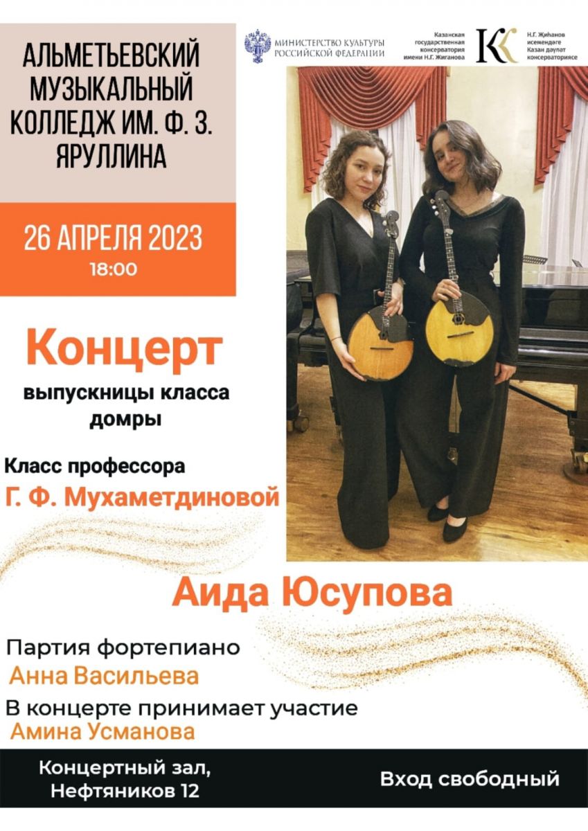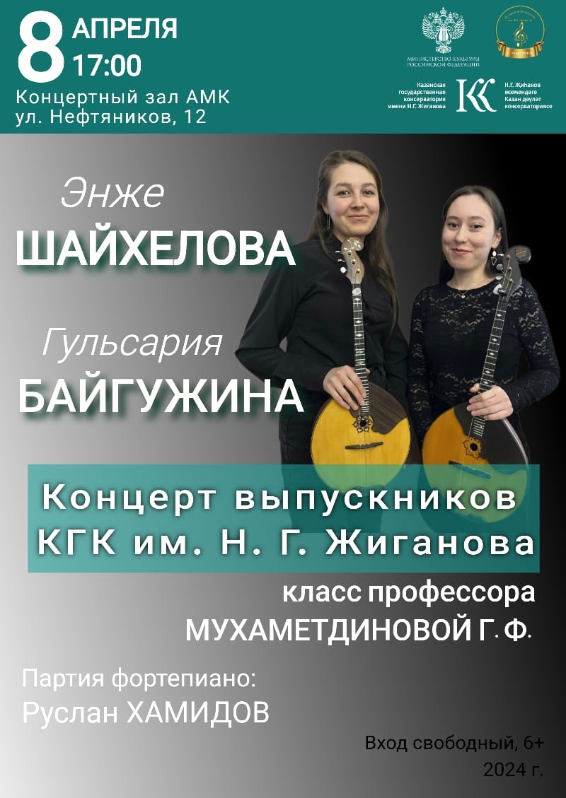 8 Апреля 2024 г. в 17:00 - Концерт выпускников Казанской государственной консерватории им.Н.Г.Жиганова Энже Шайхеловой и Гульсарии Байгужиной АФИША