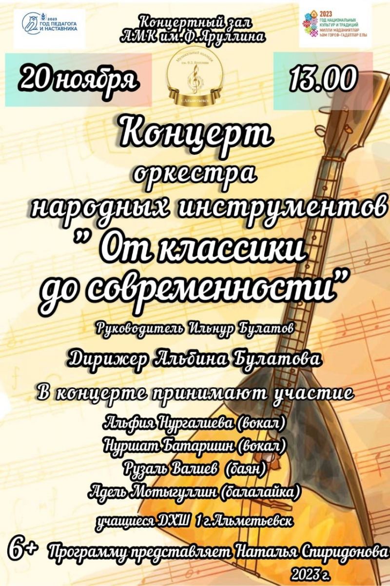 20 Ноября 2023 г. в 13:00 - Концерт оркестра народных инструментов «От классики до современности» АФИША БИЛЕТЫ