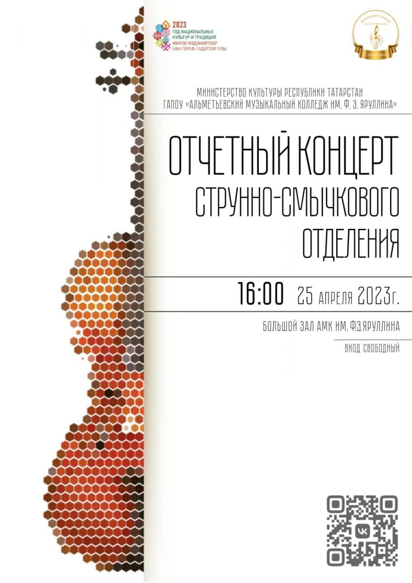 25 Аперля 2023 г. в 16:00 - Отчетный концерт специальности "Инструментальное исполнительство. Оркестровые струнные инструменты" АФИША