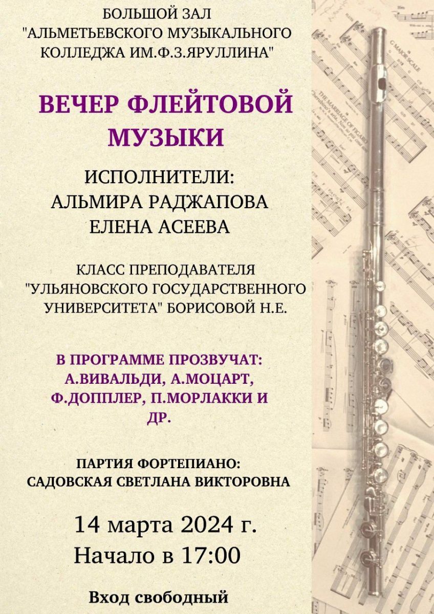 14 Марта 2024 г. в 17:00 - Вечер флейтовой музыки АФИША