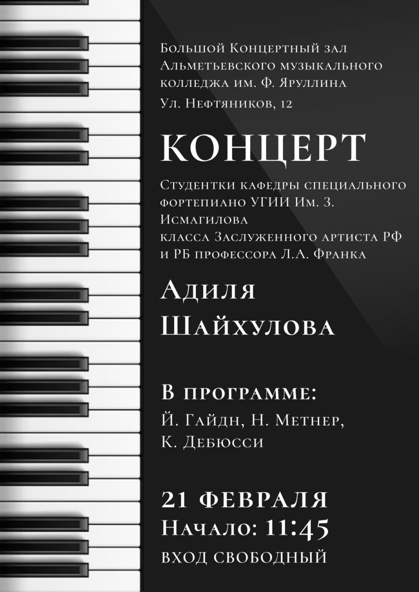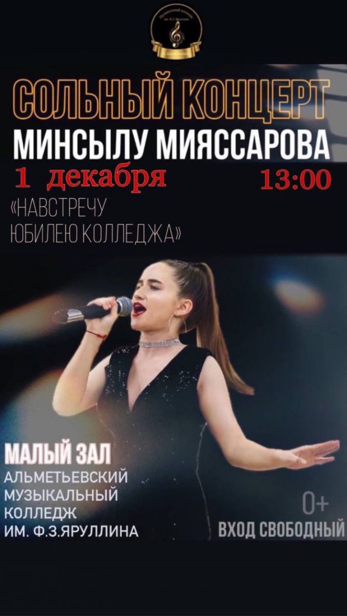 1 Декабря 2023 г. в 13:00 - Сольный концерт студентки 3 курса Минсылу Мияссаровой АФИША