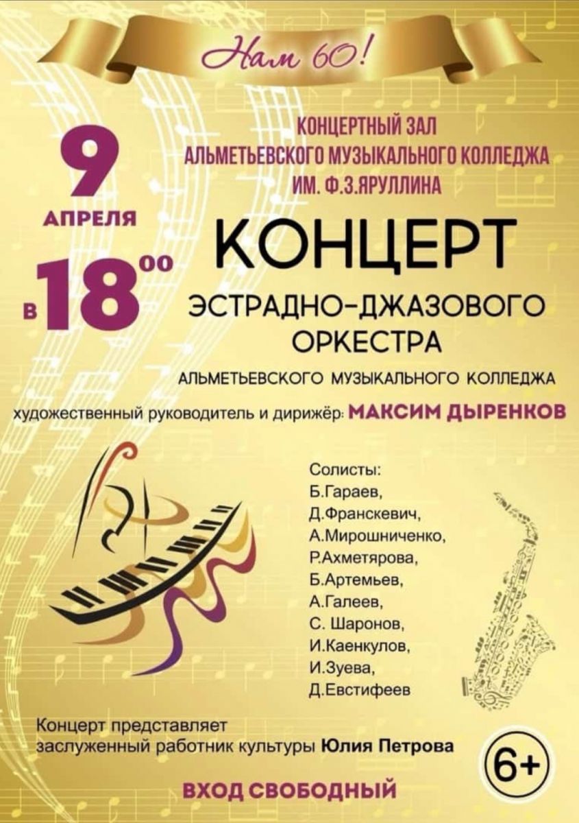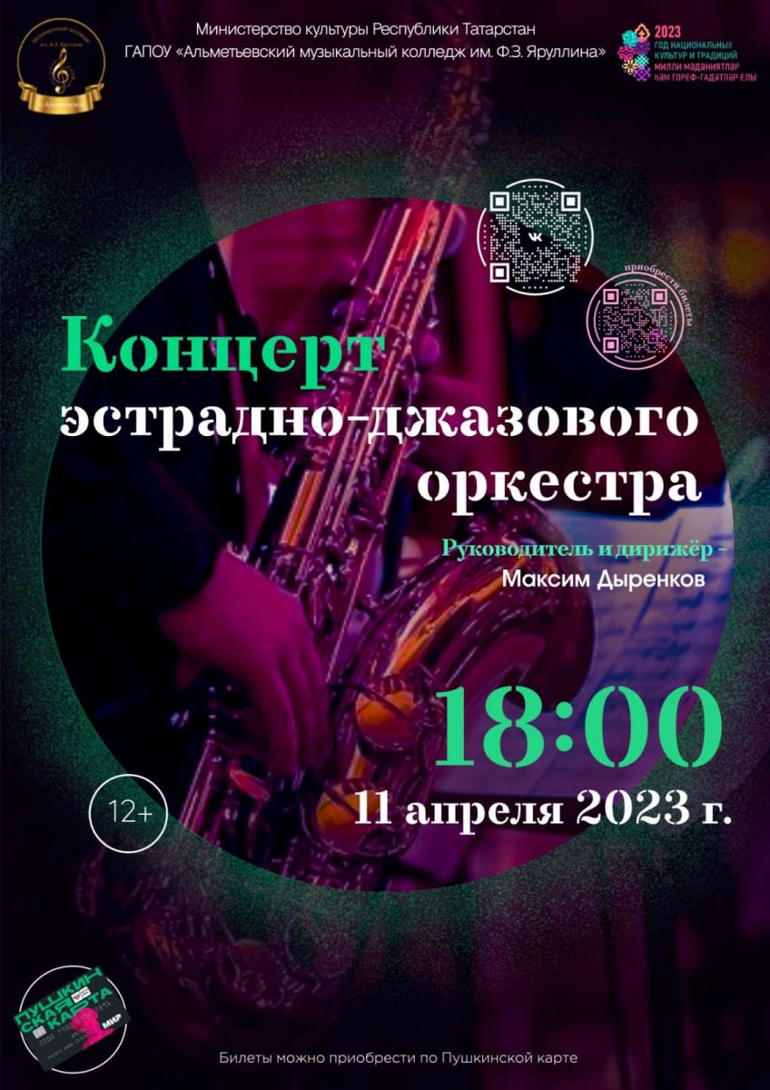 11 Апреля 2023 г. в 18:00 - Концерт эстрадно-джазового оркестра Альметьевского музыкального колледжа имени Ф.З.Яруллина БИЛЕТЫ АФИША