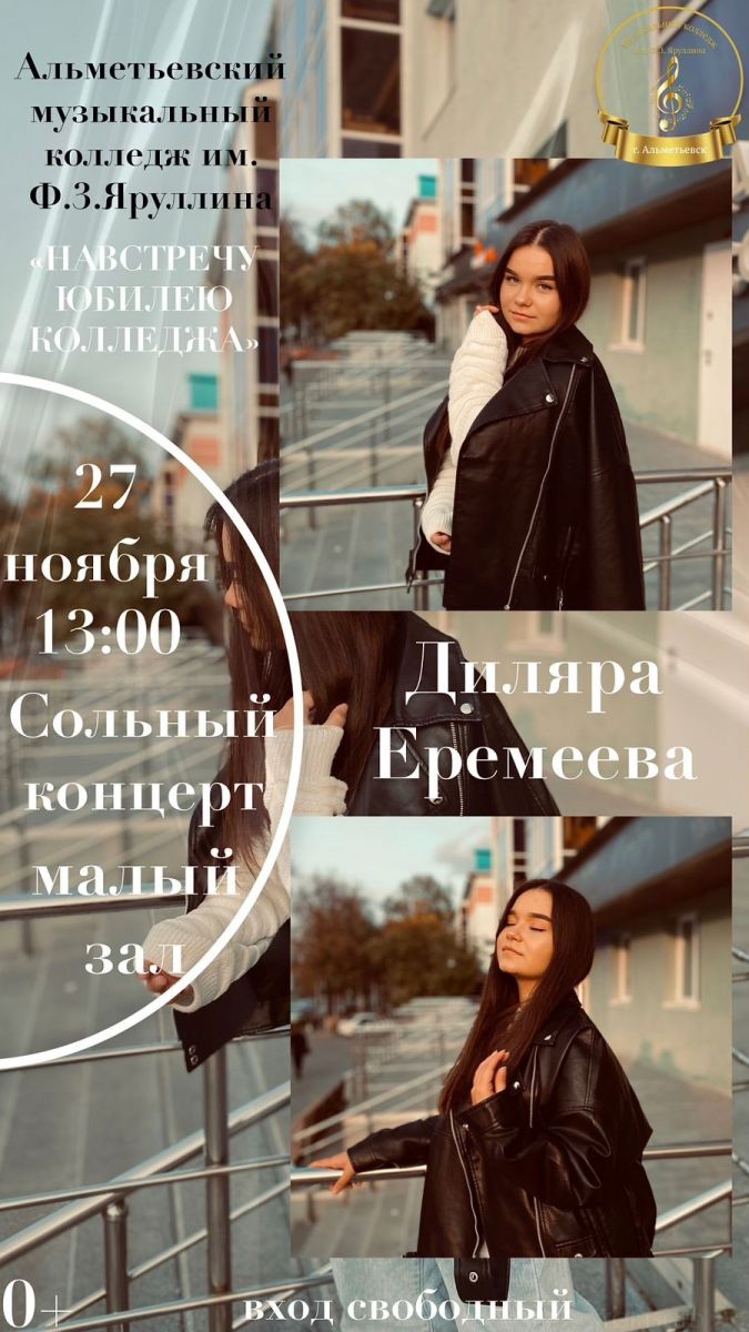27 Ноября 2023 г. в 13:00 - "Навстречу юбилею колледжа" - Сольный концерт студентки 3 курса специальности "Музыкальное искусство эстрады.Эстрадное пение" Диляры Еремеевой. АФИША