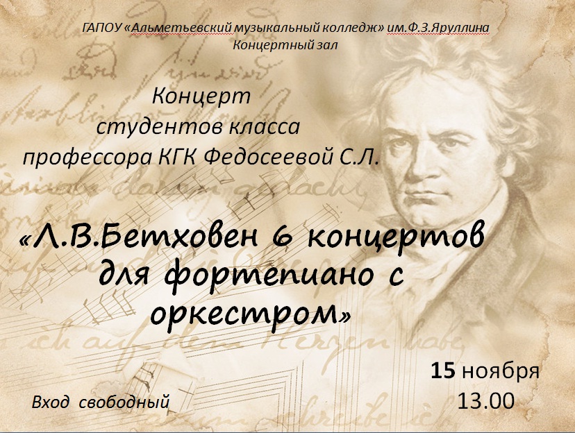15.11.16г. Концерт студентов КГК "Л.В. Бетховен 6 концертов для скрипки с оркестром" Афиша