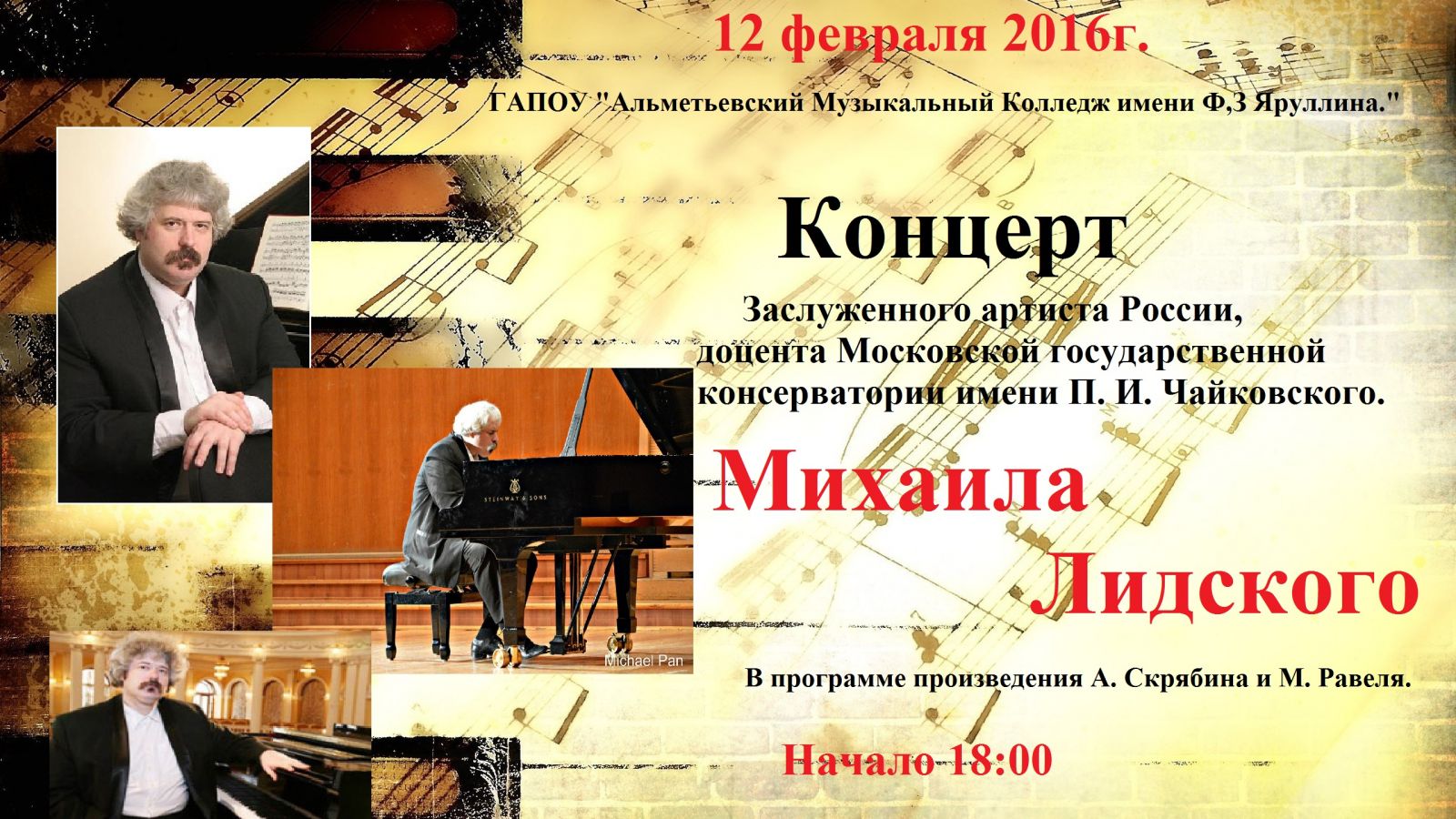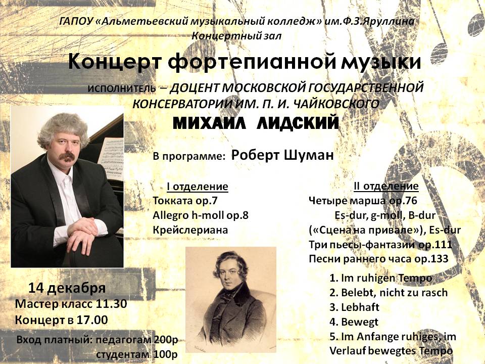 14.12.16г. Мастер-класс по фортепиано и концерт пианиста, доцента кафедры специального фортепиано Московской консерватории Михаила Лидского Афиша