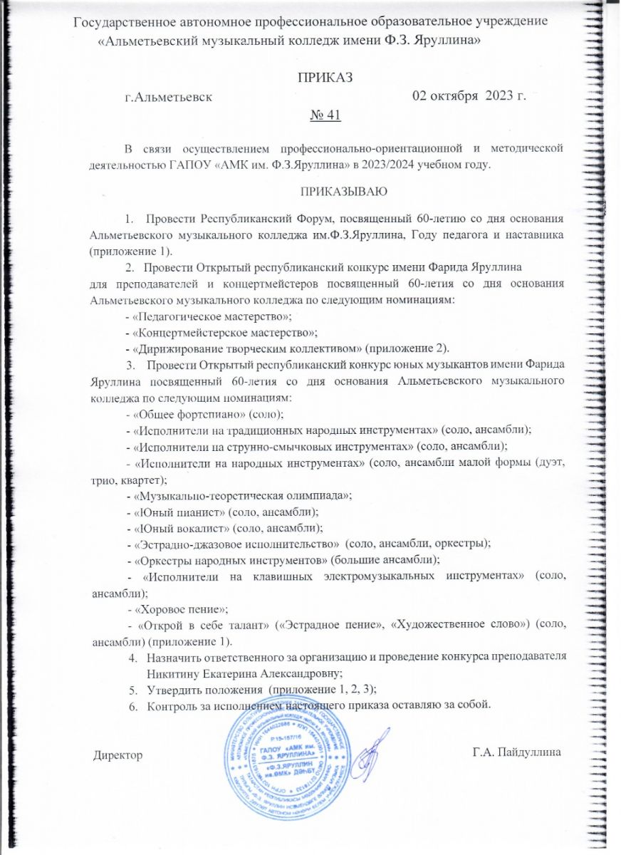 Приказ о проведении открытого Республиканского конкурса юных музыкантов имени Ф.Яруллина