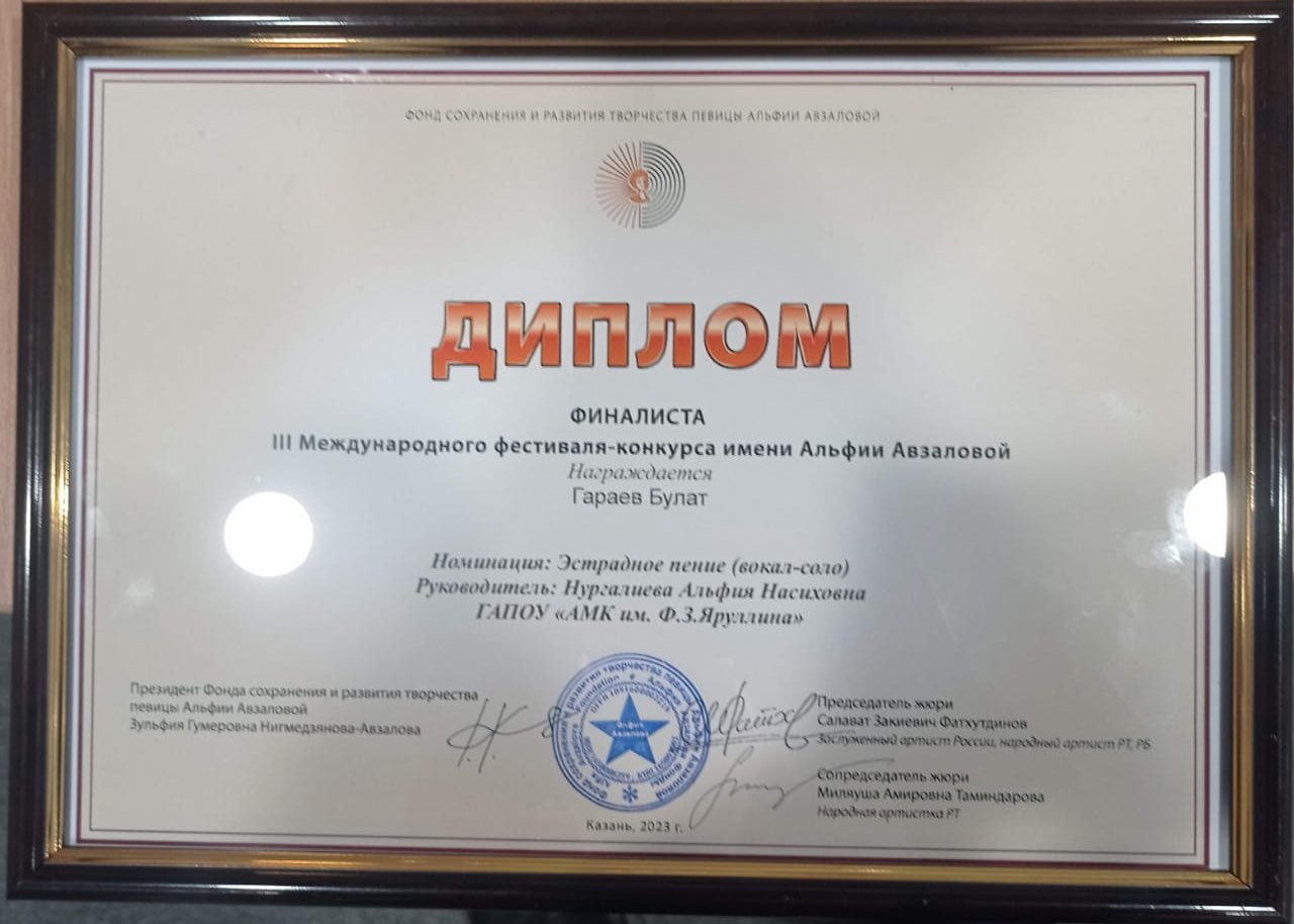 Булат Гараев-диплом финалиста.