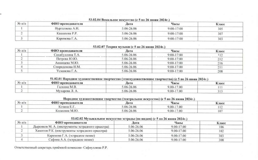 Расписание консультаций для поступающих в Альметьевский музыкальный колледж им.Ф.З.Яруллина.