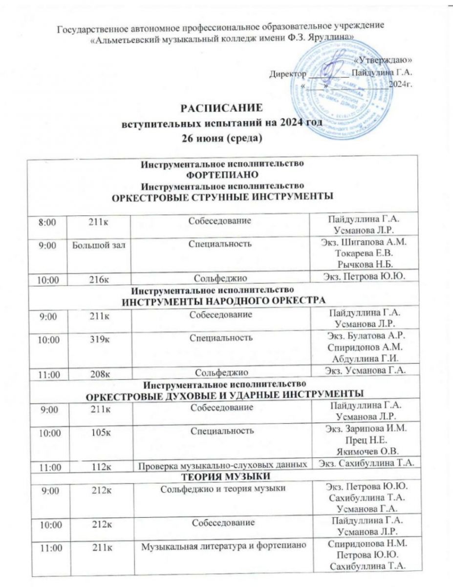 Расписание собеседований и вступительных испытаний для поступающих в Альметьевский музыкальный колледж им.Ф.З.Яруллина.