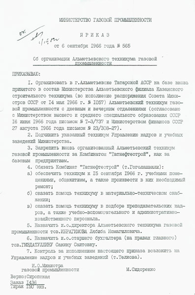 Приказ об организации техникума газовой промышленности