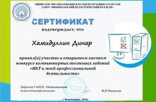 Хамидуллин Динар (31 СТМ) принимал участие в открытом заочном конкурсе компьютерных тестовых заданий "ИКТ в моей профессиональной деятельности" (руководитель Бигашева Г.Р.)