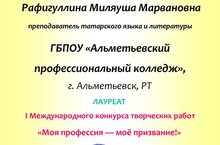 15 марта 2016 г. Землянцева С.В.-преподаватель русского языка и литературы и Рафигуллина М.М. - преподаватель татарского языка и литературы приняли участие в I международном конкурсе творческих работ "Моя профессия - мое призвание" и стали его лауреатами