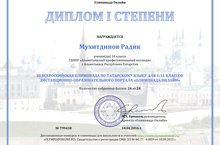 18 апреля студент нашего колледжа Мухитдинов Р. (11 НС) участвовал в III Всероссийской олимпиаде по татарскому языку дистанционно-образовательного портала "Олимпиада онлайн"и получил диплом 1 степени.