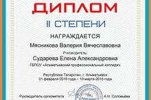 10 марта студенты колледжа Мясникова В. (11НПК) и Ильина Д. (11 НПК) приняли участие во II Всероссийской олимпиаде "Товароведение" и заняли 2 и 3 места (руководитель Сударева Е.А.)