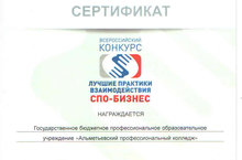 Сертификатом награжден наш колледж за участие во Всероссийском конкурсе лучших практик взаимодействия образовательных организаций с организациями реального сектора экономики по подготовке квалифицированных рабочих и специалистов со средним профессиональным образованием в номинации ЛУЧШАЯ ПРАКТИКА ВЗАИМОДЕЙСТВИЯ С ОРГАНИЗАЦИЯМИ РЕАЛЬНОГО СЕКТОРА ЭКОНОМИКИ.