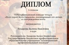 Студентка группы 31 СТМ Захарова Залина стала победительницей в V Республиканском конкурсе чтецов «Поэт-герой Муса Джалиль», посвященный 120-летию со дня рождения поэта.