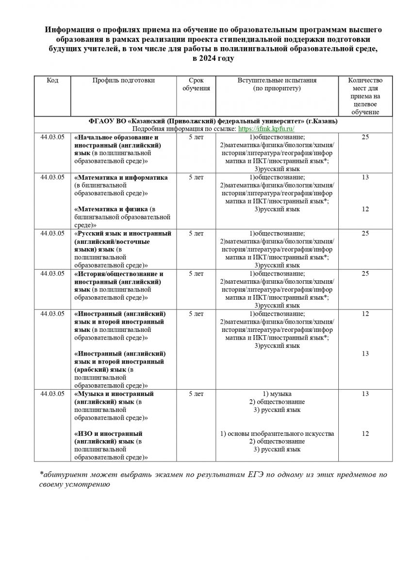 О профилях приема на обучение на целевое обучение по педагогическим профилям на 2024 год