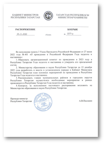 Распоряжение Кабинета министров РТ от 23.11.2022 № 2577-р «Об образовании организационного комитета по проведению в 2023 году в Республике Татарстан Года педагога и наставника и утверждении его состава»