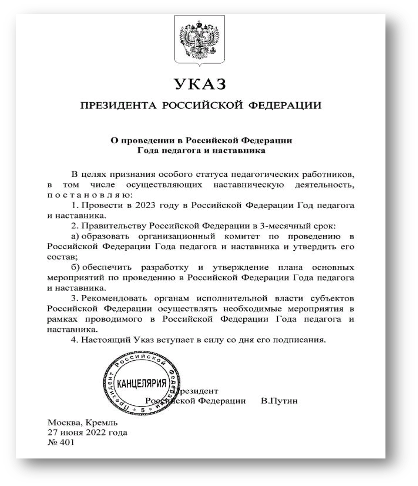 Указ Президента РФ от 27.06.2022 № 401 «О проведении в Российской Федерации Года педагога и наставника»