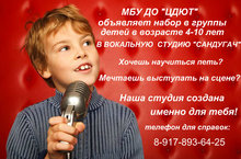 МБУ ДО "ЦДЮТ" обьявляет набор в группы детей в возрасте 4-10 лет в вокальную студию "САНДУГАЧ" .