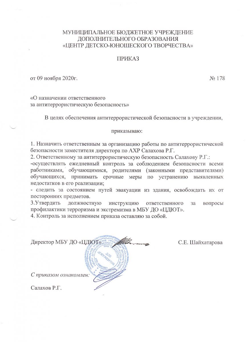 Приказ "О назначении ответственного за антитеррористическую безопасность"
