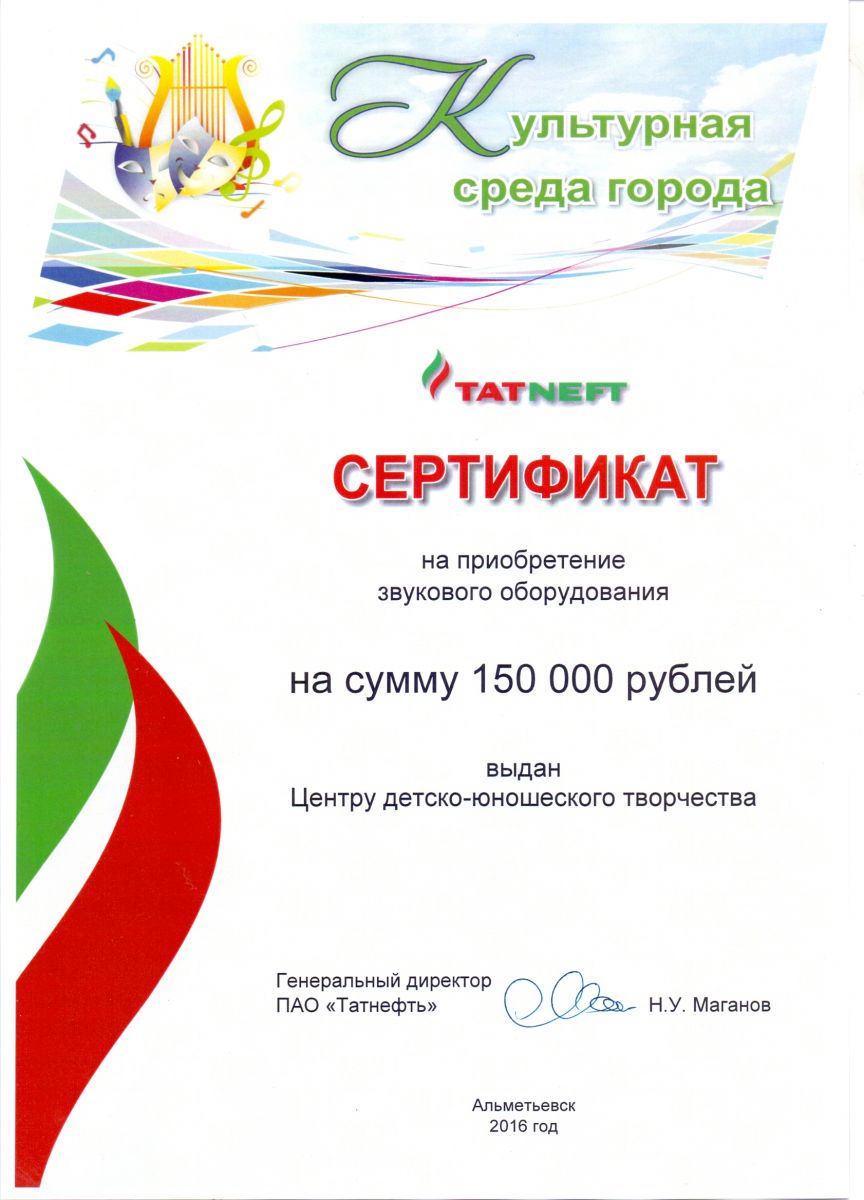 Сертификат на приобретение звукового оборудования "Культурная среда города" (2016г.)
