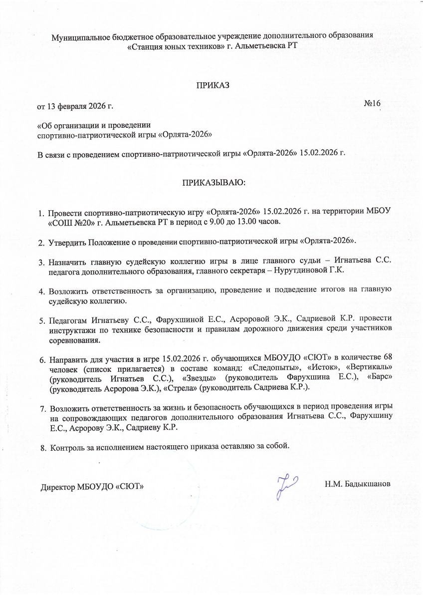 Приказ об организации и проведении спортивно-патриотической игры "Орлята-2026"