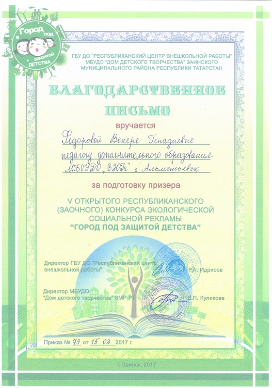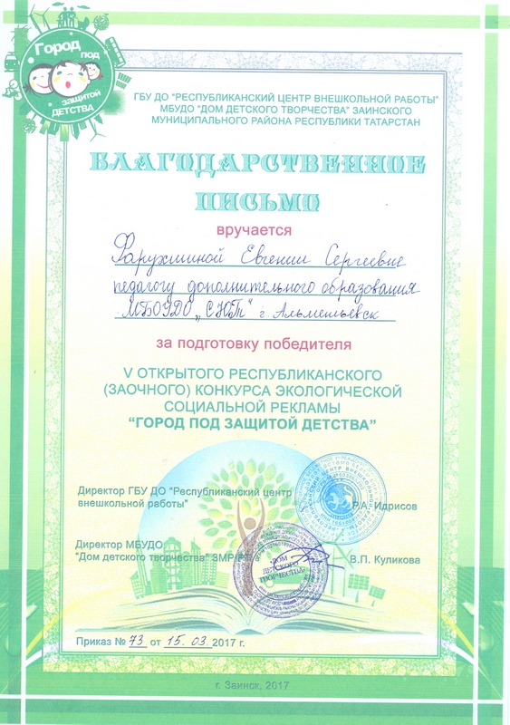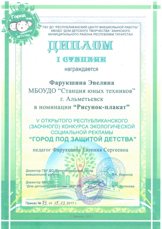 Опубликовано: 01.03.2017Учащиеся объединений «Забава» - Фарухшина Эвелина (педагог дополнительного образования – Фарухшина Евгения Сергеевна) и «Город мастеров» - Евсеев Марс (педагог дополнительного образования Федорова Венера Генадиевна) приняли участие в V открытом республиканском (заочном) конкурсе социальной экологической рекламы «Город под защитой детства» на базе МБУДО «Дом детского творчества» Заинского муниципального района РТ с 16 января по 28 февраля 2017 года.