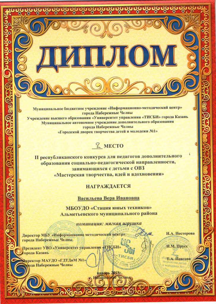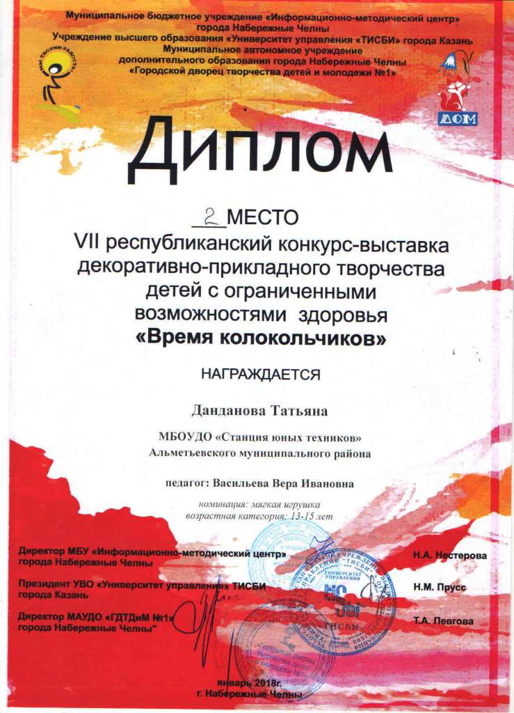 Опубликовано: 26.01.2018С 15 декабря 2017 года по 23 января 2018 года в выставочном зале Дворца «Синяя птица» г. Набережные Челны прошёл VII республиканский конкурс-выставка декоративно-прикладного творчества детей с ограниченными возможностями здоровья «Время колокольчиков» и II республиканский конкурс для педагогов дополнительного образования социально-педагогической направленности, занимающихся с детьми с ОВЗ «Мастерская творчества, идей и вдохновения». Активное участие приняли учащиеся объединения «Юные кудесники» - Данданова Татьяна и Яшина Анастасия, а также их педагог дополнительного образования – Васильева Вера Ивановна.