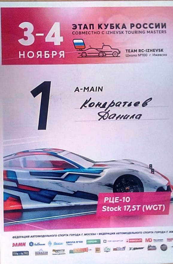 Опубликовано: 05.11.2018В период осенних каникул с 3 по 4 ноября 2018 года в г. Ижевске прошёл этап Кубка России по автомодельному спорту. В соревнованиях приняли участие 47 пилотов с 51 моделью из городов - Москва, Ижевск, Глазов, Альметьевск, Киров, Пермь, Добрянка и Екатеринбург. Наш город представил автомоделист Станции юных техников - Кондратьев Данила. Он выступил достойно, став победителем в классе моделей РЦЕ-10 Stock 17.5Т (WGT) и призёром в классе моделей РЦЕ-12 Stock 13.5Т.