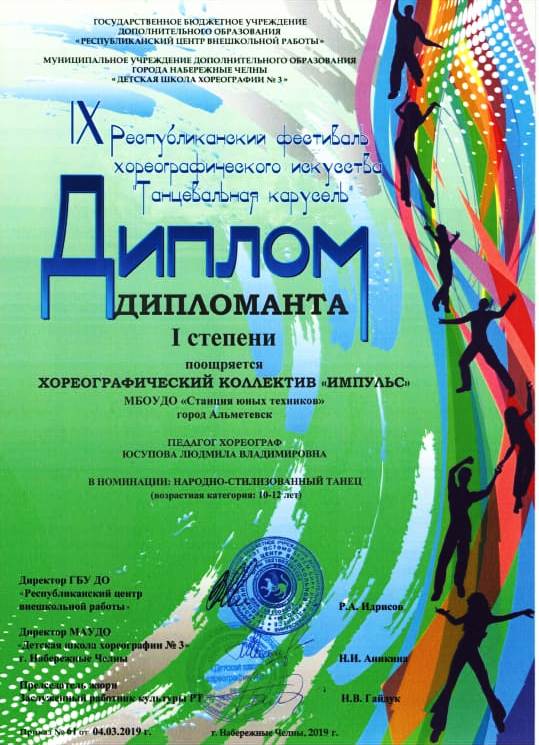 Опубликовано: 04.03.20192 марта 2019 года обучающиеся объединения «Импульс» под руководством педагога дополнительного образования Юсуповой Л.В. выступили на конкурсе "Танцевальная карусель" г. Набережные Челны" и стали дипломантами I и II степени.