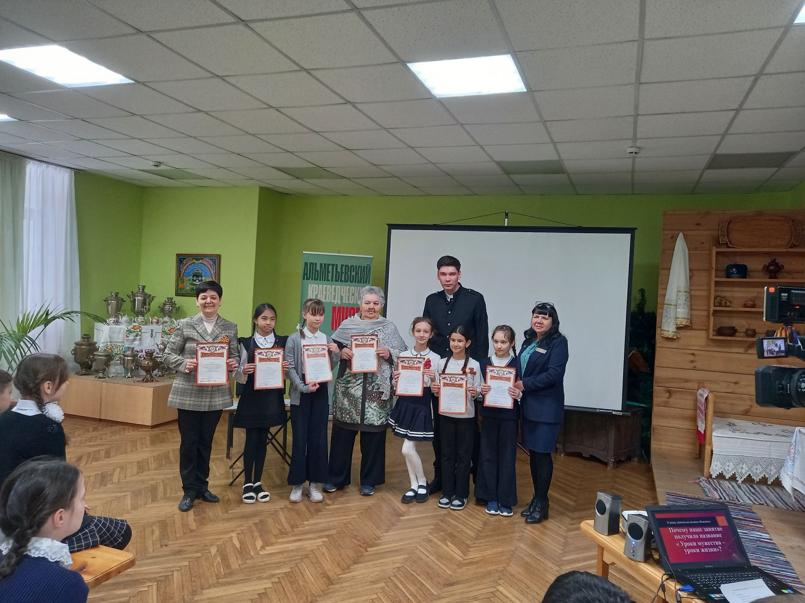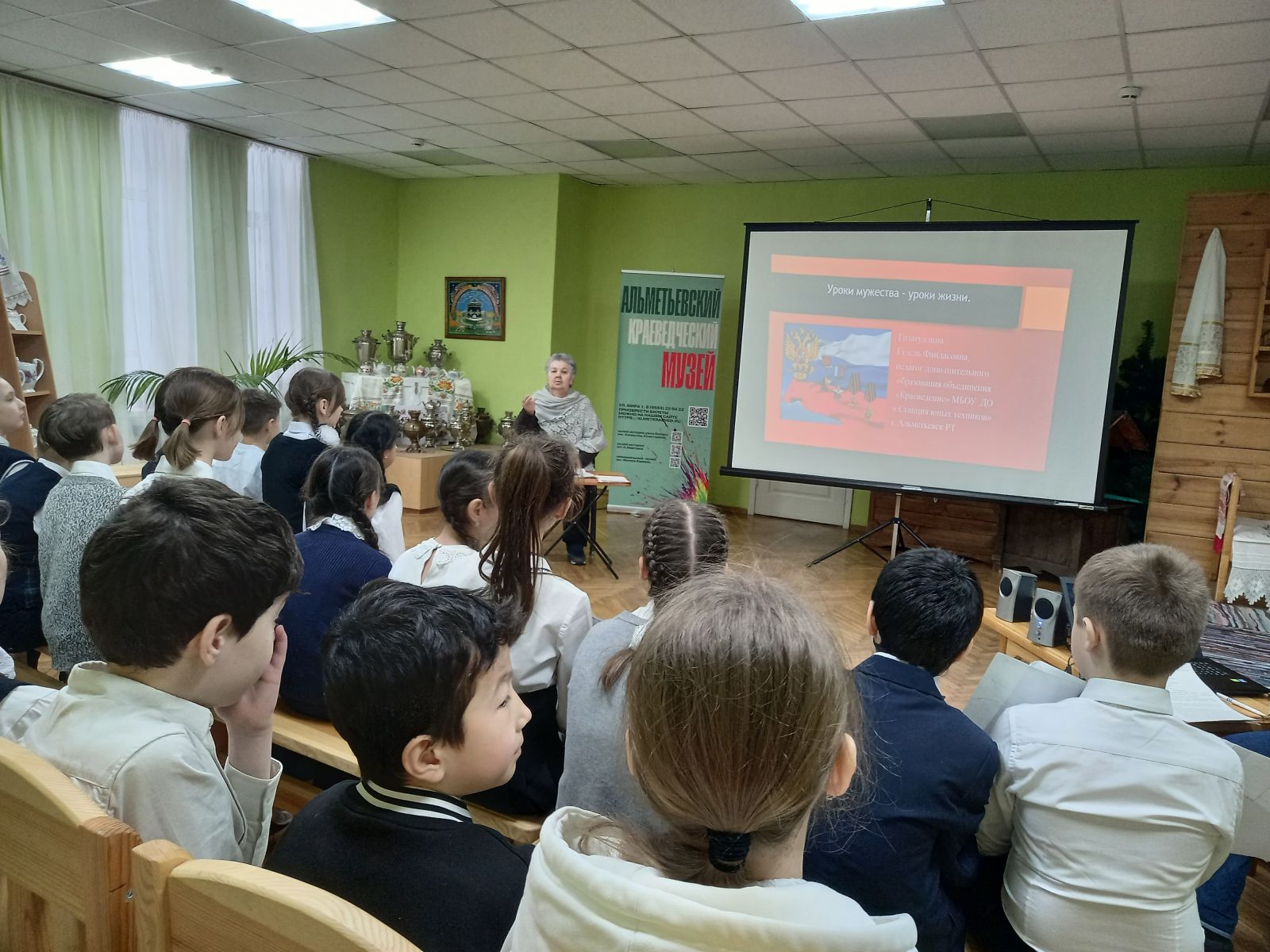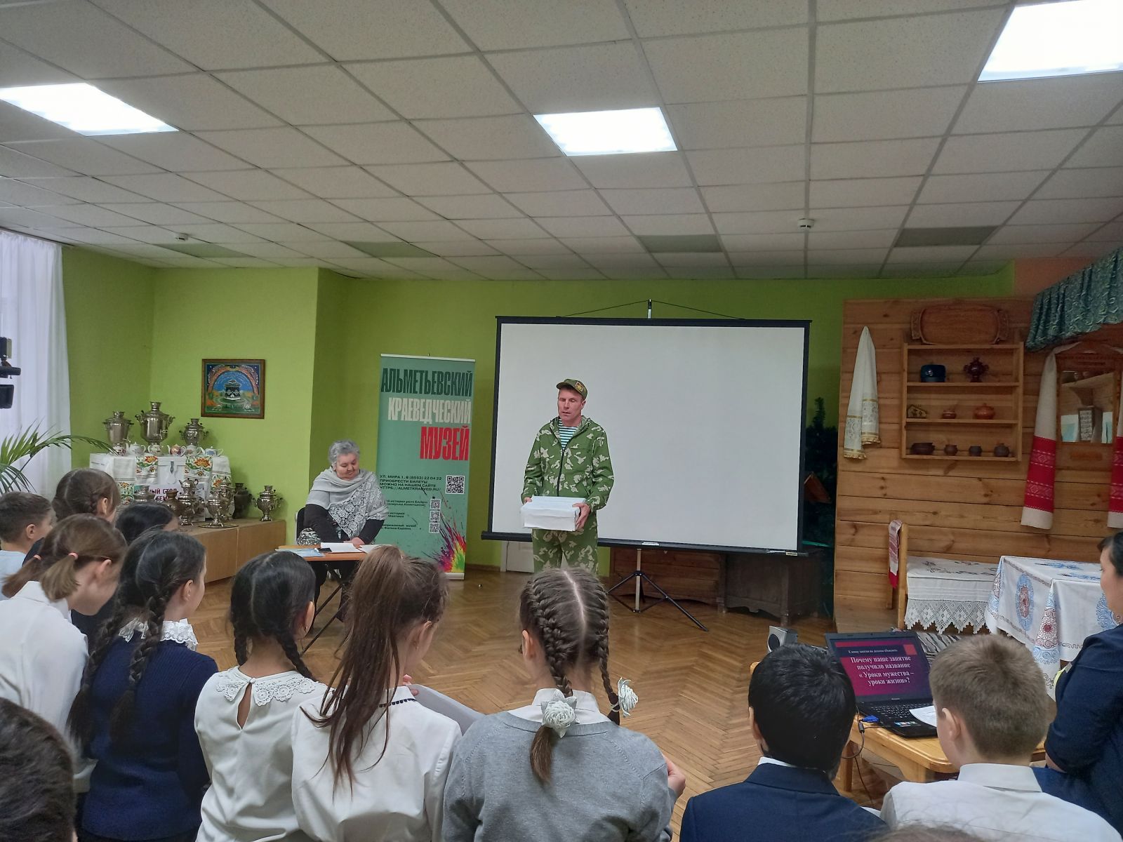 Опубликовано: 08.02.2024В рамках программы "Содружество" совместно с Альметьевским краеведческим музеем в объединении "Краеведение" с обучающимися третьего года обучения прошёл Урок Мужества, музейный урок "Уроки мужества - уроки жизни ". На мероприятии директор музея Газизуллин А.Н. подвел итоги совместно объявленного конкурса рисунков « Был город- фронт, была блокада». .Краеведы продемонстрировали созданные ими в ходе подготовки к мероприятию стенгазеты, вручили приготовленные рисунки и поделки « Дети солдатам» Евлееву С. Е., представляющему местную общественную организацию пограничников запаса "Застава"