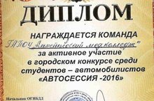 16 сентября 2016 года прошел городской конкурс среди студентов- автомобилистов "Автосессия - 2016". Студенты нашего колледжа Батыршин Айнур (ЛД 14 А), Талипов Ильшат (ЛД 14 А) и Эргашзода Ахтам (ЛД 13 А) приняли в нем активное участие и были награждены дипломом участника и ценным призом.