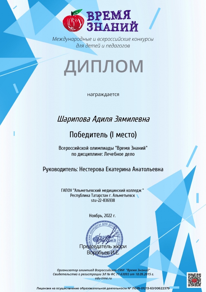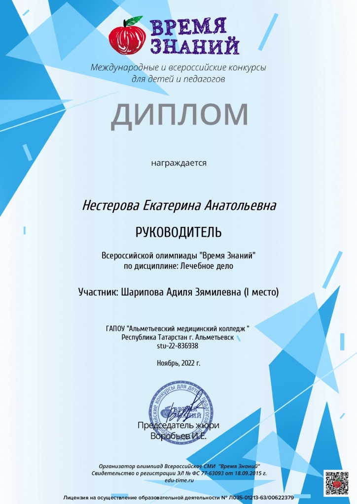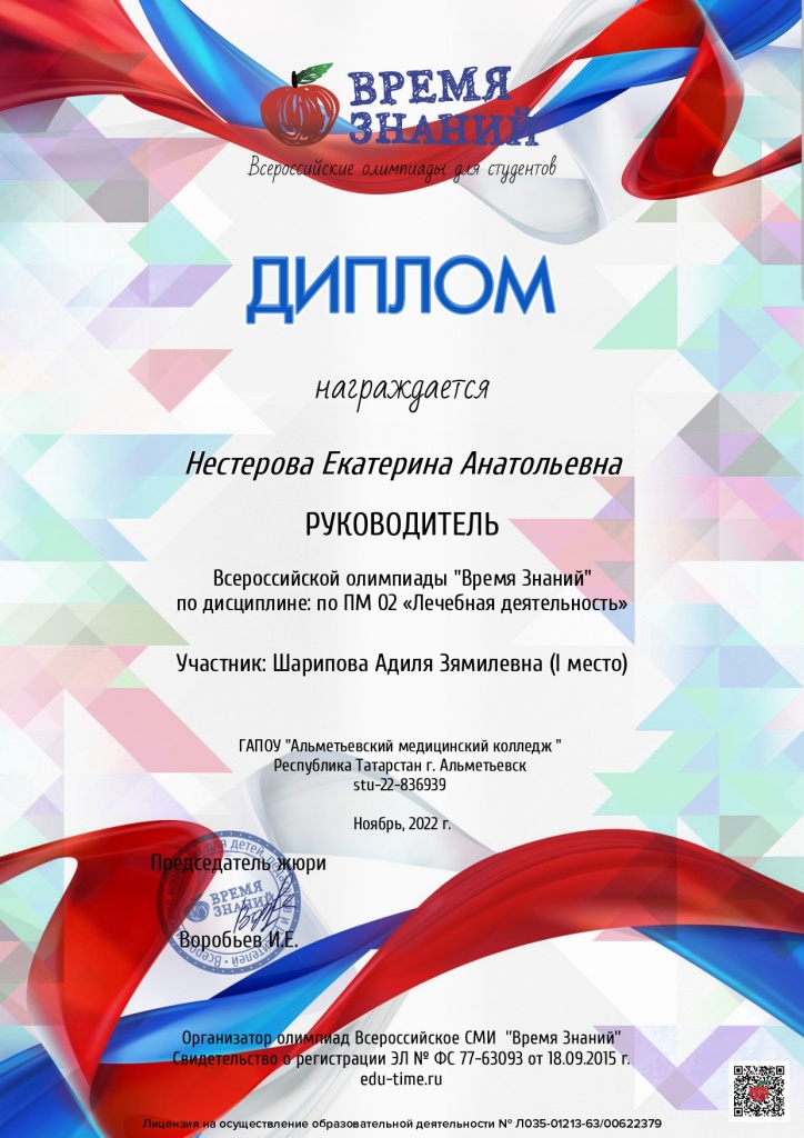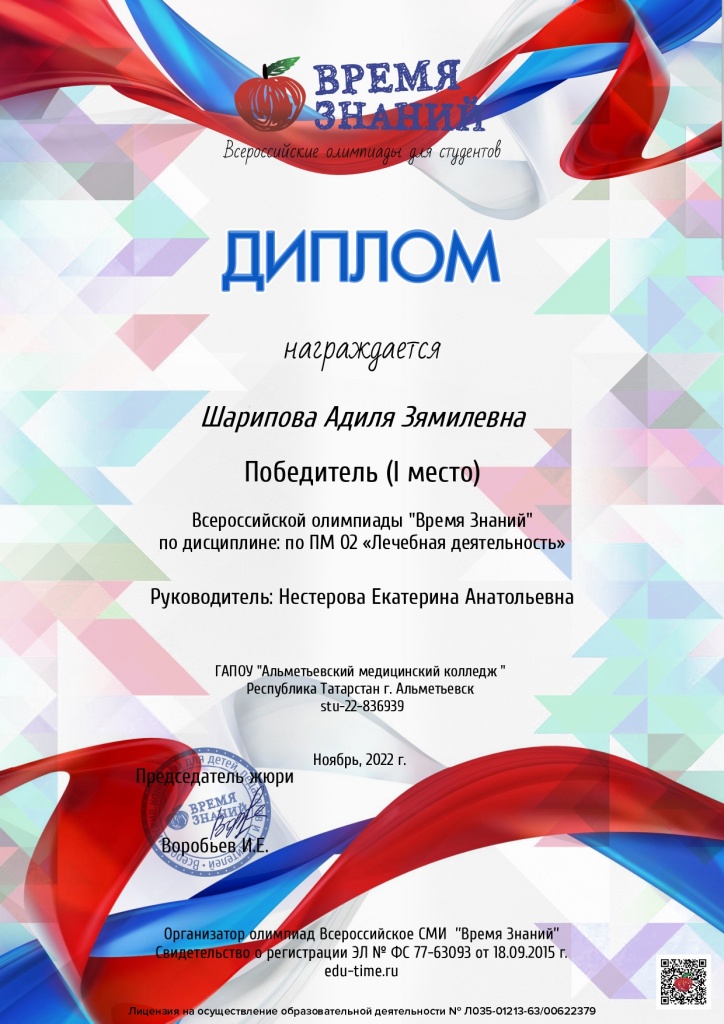 Опубликовано: 01.12.2022Поздравляем Шарипову Адилю Замилевну и её руководителя Нестерову Екатерину Анатольевну с победой во Всероссийской олимпиаде «Время Знаний» по дисциплинам Лечебное дело и Лечебная деятельность. Желаем дальнейших успехов!