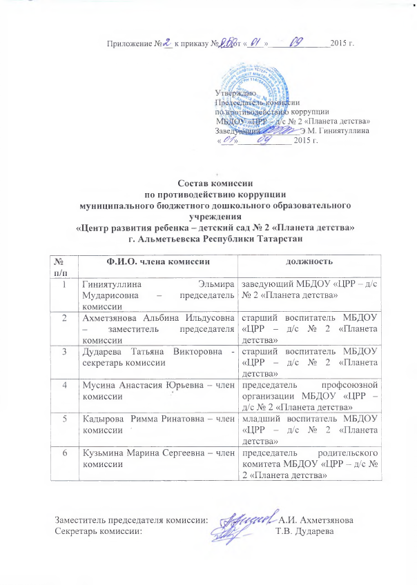 Состав комиссии по противодействию коррупции МБДОУ "ЦРР - д/с № 2 "Планета детства"