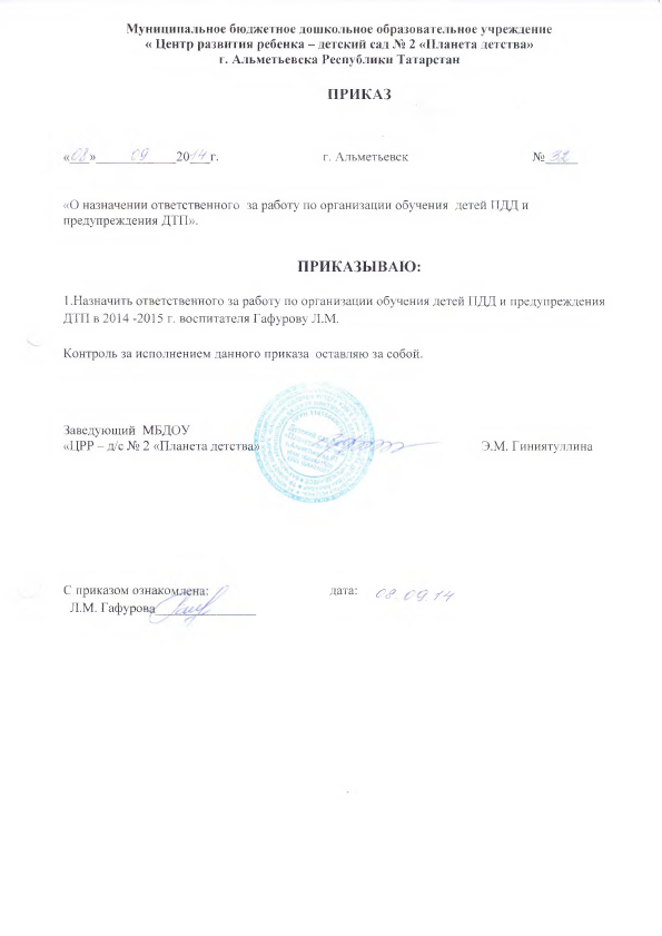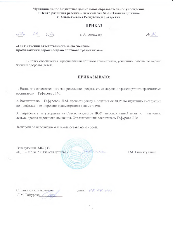Приказ "О назначении ответственного за обеспечение профилактики дорожно - транспортного травматизма"