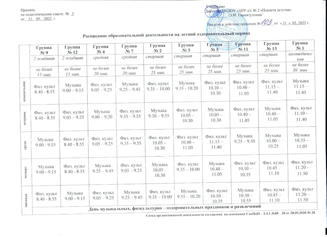 Расписание организованной образовательной деятельности на летний оздоровительный период в 2022 году.