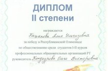 В республиканской олимпиаде, состоявшейся 19 апреля 2019 года на базе ГАПОУ «Казанский педагогический колледж», приняли участие 44студента профессиональных заведений республики. Кашапова Алия достойно представила техникум, набрав 73 балла из 80 возможных.