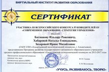 Багманова И.Р., Хабарову Н.Г., Захарову И.М. с получением сертификата участников Всероссийского конкурса руководителей ОУ «Современное образование: стратегии управления», на котором была представлена Программа развития государственного автономного образовательного учреждения среднего профессионального образования «Альметьевский политехнический техникум» на 2013-2017 годы. Организатор и Учредитель Конкурса – Виртуальный Институт развития образования (ВИРО). -