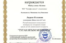 Поздравляем Файзуллину Айлину, участницу Республиканского вокального конкурса на татарском языке среди детей дошкольного возраста "Туган ягым моңнары" 11.03.2026